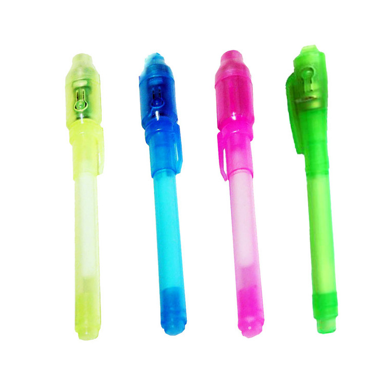 با استفاده از این قلم میتوانید هر نوع متن را نوشته و آن را از دید مخفی نگهدارید . با تاباندن نور فرابنفش به متن ، نوشته شما روشن شده و به نمایش در می آید . با استفاده از این محصول می توانید طیف وسیعی از نوشته های مخفی را ایجاد کنید . این نوشته برای کنترل گارانتی ، حفظ و امنیت اسناد ، کنترل تردد افراد مجاز و .... بکار میرود. بسته ارسالی شامل 4 عدد خودکار نامرئی شوخی به رنگهای سبز , زرد , صورتی , آبی خواهد بود.