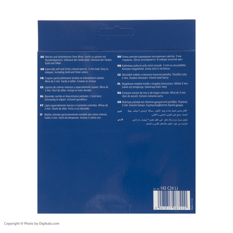دستهبندی: مداد رنگیطول بدنه: 175 میلیمتروزن: 160 گرمقطر سطح مقطع: 6 میلیمترتعداد رنگهای موجود در بسته: 24جنس جعبه : مقواییسایر توضیحات : - مغزی بسیار نرم - رنگهای بسیار غنی - قطر مغزی 3 میلیمتر - تراش آسانابعاد : 21x17.5x1 سانتیمترنمایش بیشتر